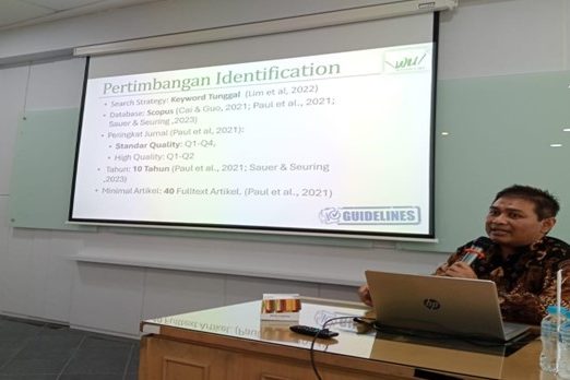 Workshop ini menghadirkan Dr. Lilik Wahyudi, S.E., M.Si., Dosen Fakultas Ekonomi dan Bisnis Universitas Sebelas Maret sekaligus penggagas platform Watase UAKE, sebagai narasumber utama. Dalam sesi intensif, peserta dibimbing untuk memahami pendekatan Systematic Literature Review (SLR) berbasis metode PRISMA dan SPAR-4-SLR, serta pemanfaatan teknologi berbasis AI untuk mengotomatisasi proses identifikasi literatur, analisis tematik, dan sintesis artikel ilmiah. Platform Watase UAKE diperkenalkan sebagai alat inovatif yang mampu mempercepat proses kajian literatur secara sistematis, meningkatkan efisiensi riset, dan memperkuat kualitas publikasi ilmiah.