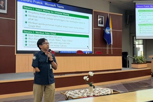 The training featured the Vice Dean for Finance, Assets, and Human Resources, Dr. techn. Khabib Mustofa, S.Si., M.Kom., as the speaker. During the session, he delivered a presentation on the utilization of Microsoft Teams and Google Meet as tools to support communication, coordination, and collaboration in academic and administrative settings.