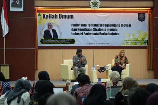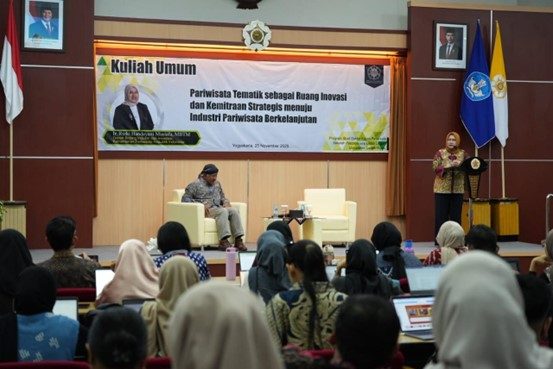 Yogyakarta, 25 November 2025 – Transformasi sektor pariwisata Indonesia memasuki babak baru, beralih dari sekadar kuantitas menuju model pembangunan yang berorientasi pada kualitas, nilai tambah, dan keberlanjutan. Sebagai respons dan dukungan nyata terhadap visi strategis Menteri Pariwisata, Ibu Widiyanti Putri Wardhana, Program Studi Doktor Kajian Pariwisata Sekolah Pascasarjana (SPs) Universitas Gadjah Mada (UGM) berkolaborasi dengan Deputi Bidang Industri dan Investasi Kementerian Pariwisata dan Ekonomi Kreatif (Kemenparekraf) menyelenggarakan Kuliah Umum strategis. Acara yang bertajuk “Pariwisata Tematik sebagai Ruang Inovasi dan Kemitraan Strategis menuju Industri Pariwisata Berkelanjutan” ini berlangsung di Ruang Auditorium, Lantai 5 Gedung SPs UGM, dari pukul 08.30 hingga 11.30 WIB.