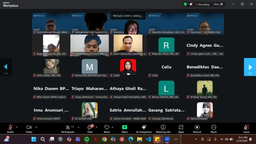 Yogyakarta, 14 Januari 2026 – Program Studi Magister Manajemen Bencana Sekolah Pascasarjana Universitas Gadjah Mada telah sukses menyelenggarakan webinar yang bertajuk SAFE (Seminar on Awareness for Everyone) “Cuaca Ekstrem di Negeri Khatulistiwa: Membangun Kesiapsiagaan Masyarakat di Tengah Meningkatnya Anomali Hidrometeorologi”. Kegiatan ini dilaksanakan secara daring yang dihadiri oleh mahasiswa, dosen, praktisi, serta perwakilan dari berbagai pemerintah daerah.